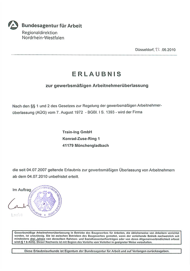 Die Train-Ing GmbH verfügt eine Erlaubnis zur Arbeitnehmerüberlassung.